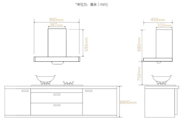 2、為方便煙機安裝,櫥柜需預留一定空間,在產品尺寸的基礎上,建議多預留30㎜