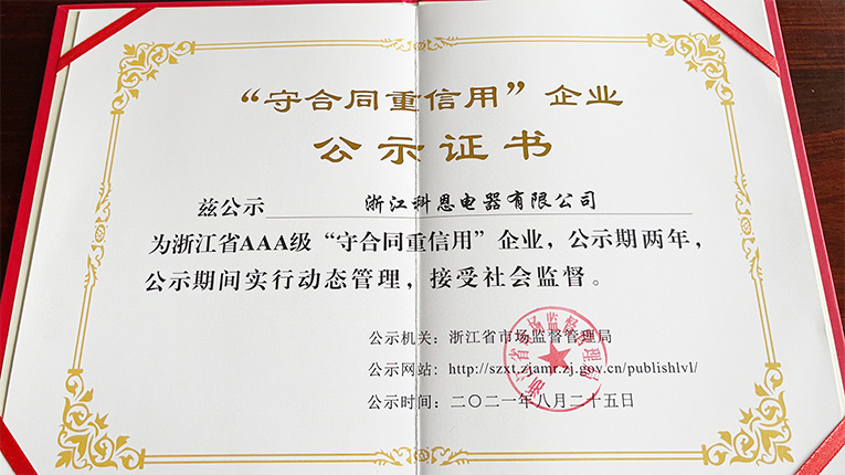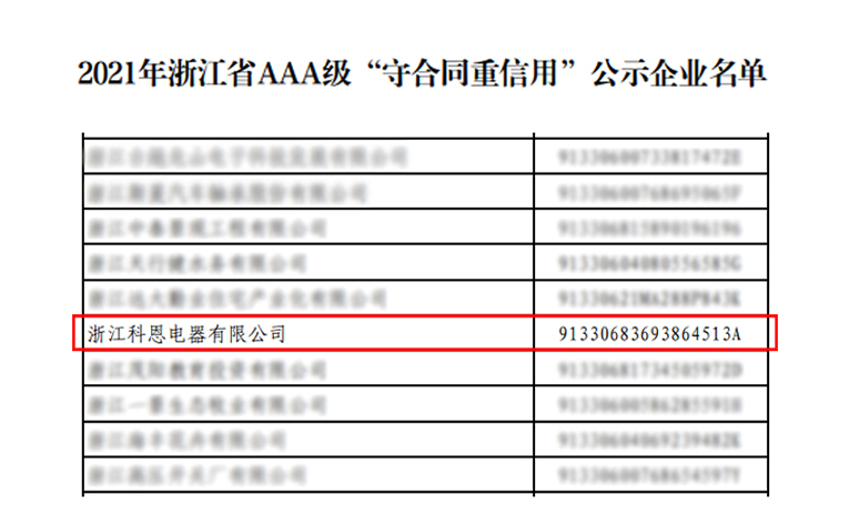根據(jù)《浙江省“守合同重信用”企業(yè)公示辦法》規(guī)定,由企業(yè)自愿申報、系統(tǒng)自動測評、各地核實推薦、大數(shù)據(jù)比對和雙隨機實地核查,2021年浙江省AAA級“守合同重信用”企業(yè)公示名單出爐,憑借著誠信守法的“契約”精神,嚴(yán)謹(jǐn)規(guī)范的合同管理體系以及良好的經(jīng)營效益,進(jìn)一步強化“守法”意識的浙江科恩電器有限公司榮獲浙江省AAA級“守合同重信用”榮譽。