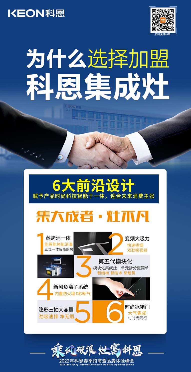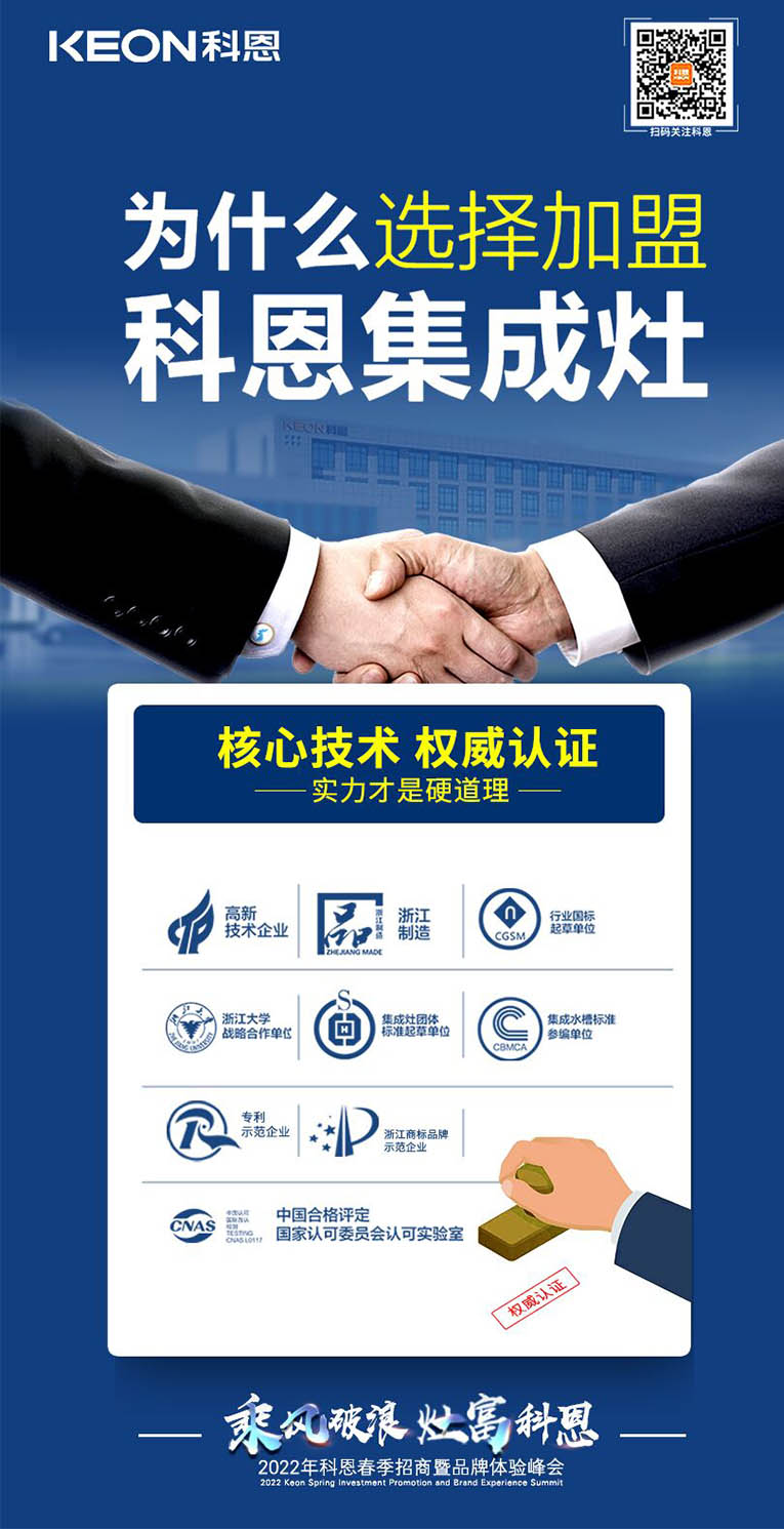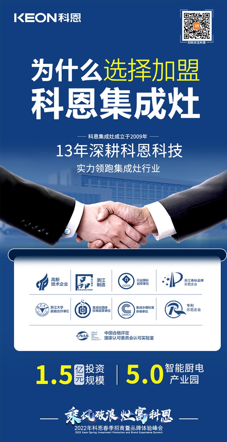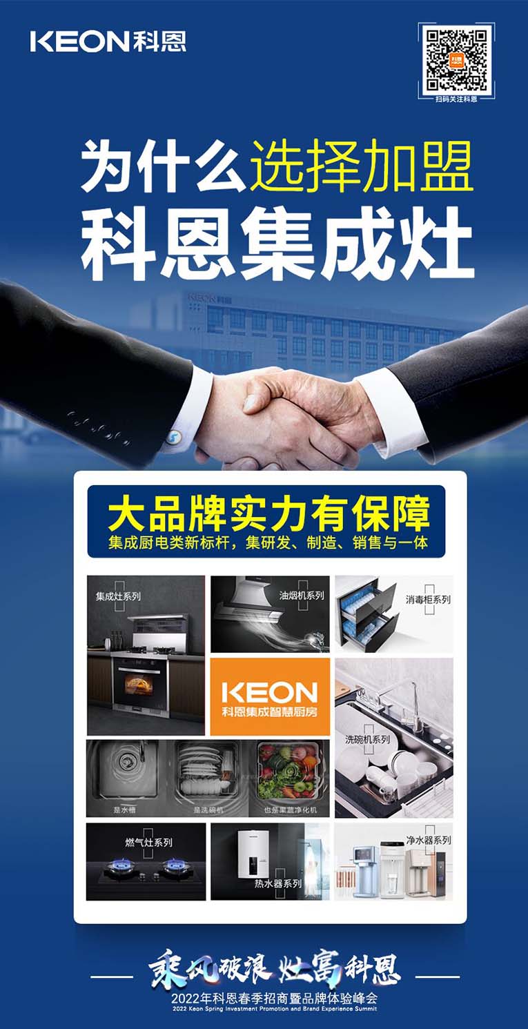 “乘風破浪,灶富科恩”2022科恩春季招商暨品牌體驗峰會將于3月18日舉行,選擇大于努力,抓住時代機遇!集成灶十大品牌、廚電行業(yè)十大品牌科恩集成灶具備優(yōu)于業(yè)界的技術、高質量的保證、強大的企業(yè)實力、有保障的售后等優(yōu)勢,實力加盟的不錯之選。