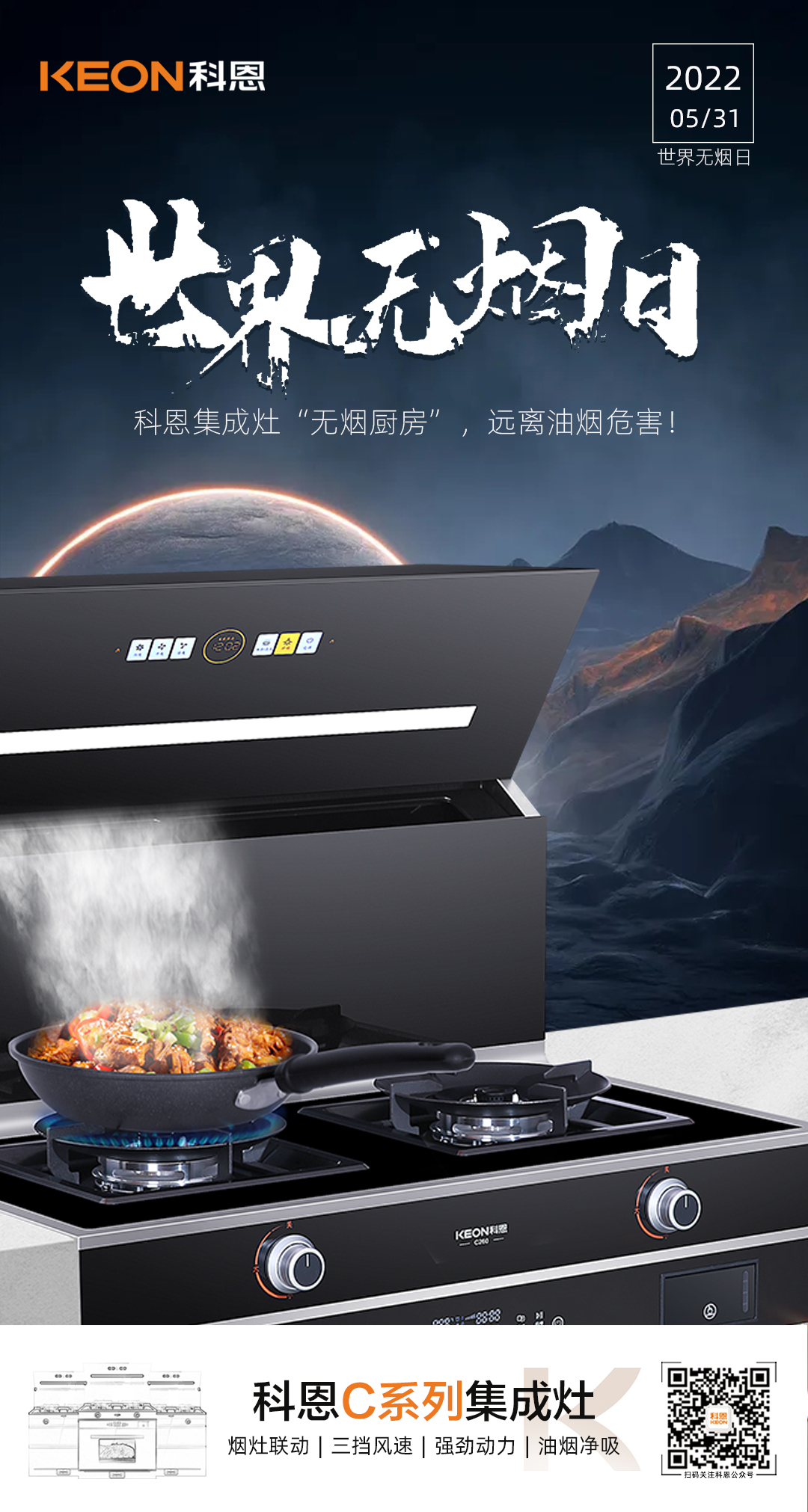 世界無煙日|科恩C260蒸烤消炸集成灶,讓廚房輕松戒煙!