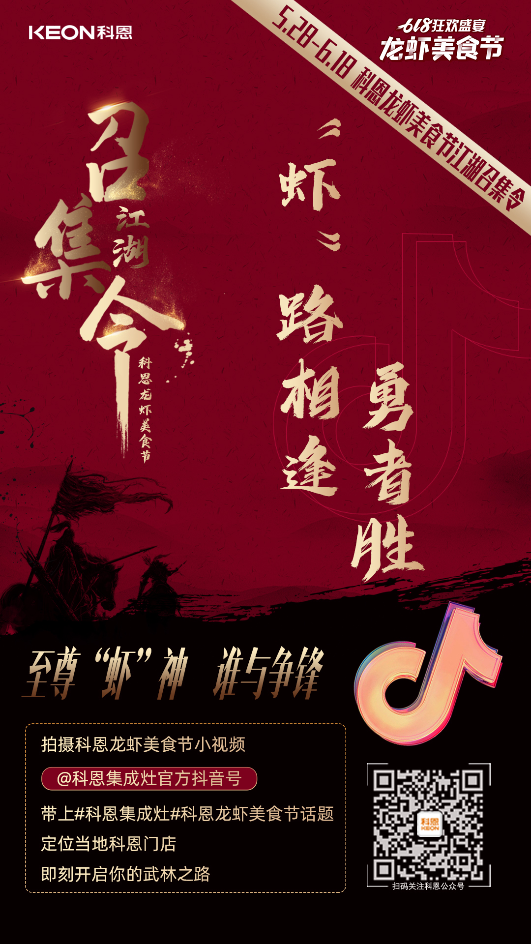 各位俠士,請妥存這份武林大會規則寶典,江湖美味,缺你不可!只要關聯科恩龍蝦美食節,體現科恩元素并上傳至私人抖音號,@浙江科恩電器有限公司官方抖音號,帶上話題#科恩龍蝦美食節 #科恩集成灶,定位當地科恩門店位置即可!
