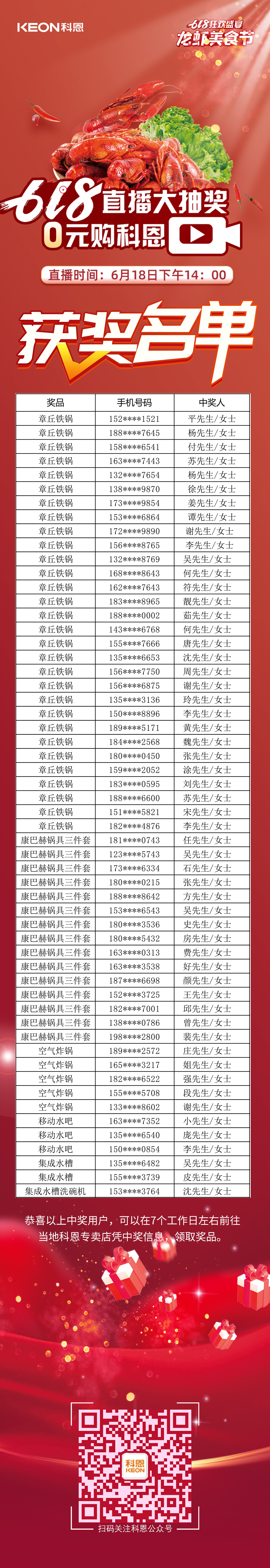 萬人品美食,0元搶科恩——科恩龍蝦美食節(jié)圓滿落幕,千城千店,共襄盛舉,感謝大家對科恩集成灶的大力支持,618直播大抽獎獲獎名單火熱出爐,恭喜以上獲獎的小伙伴們,請盡快聯(lián)系當?shù)?a href="http://m.mingqq.cn/" target="_blank">科恩門店,快把獎品領回家吧!