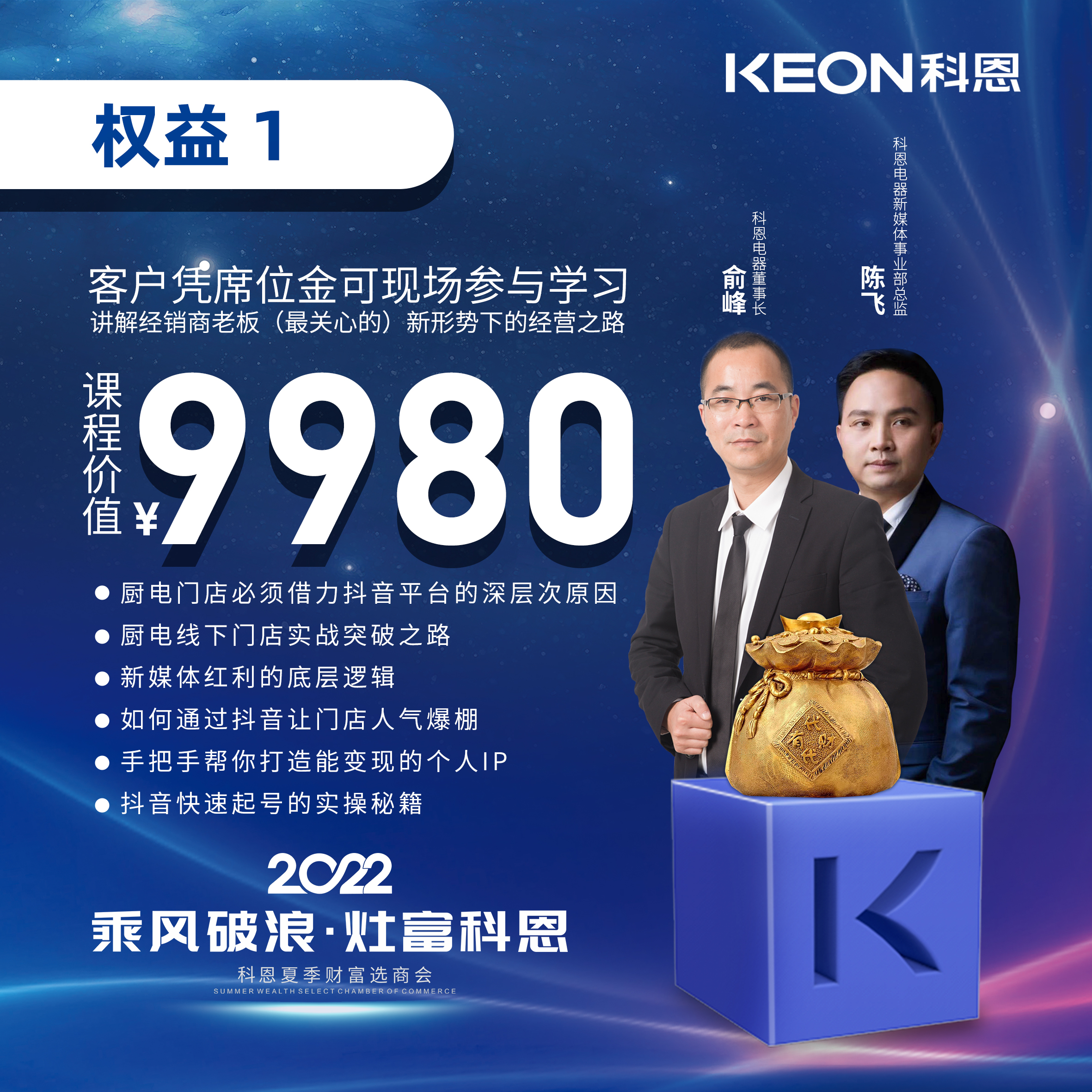 權(quán)益一、客戶憑席位金可現(xiàn)場參與學習時下經(jīng)銷商老板最為關(guān)心的新形勢下的經(jīng)營之路,科恩電器董事長攜新媒體事業(yè)中心團隊親身入局,創(chuàng)新立意開辟抖音引流變現(xiàn)的新賽道新玩法,手把手幫你打造能變現(xiàn)的個人IP,助力經(jīng)銷商在新零售市場前景下,輕松實現(xiàn)彎道超車。