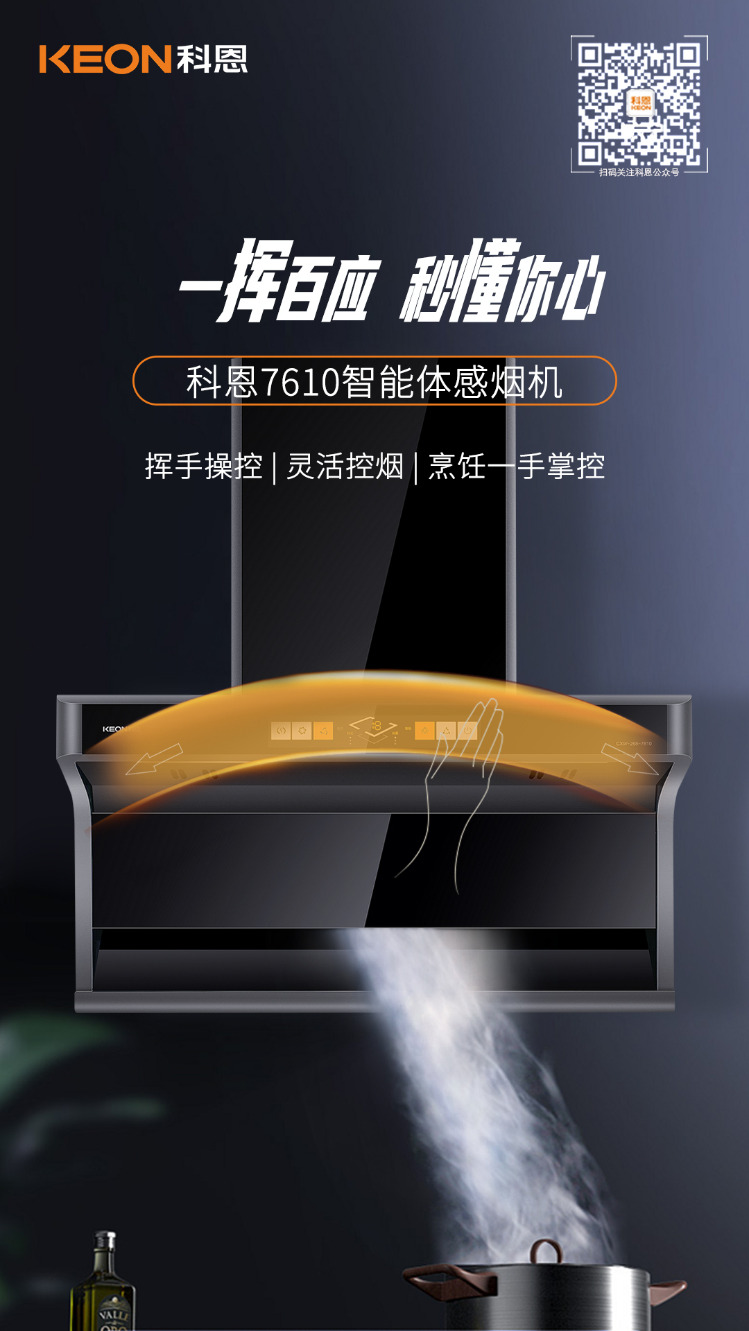科恩7610采用了智能體感操控系統(tǒng),無需觸碰煙機(jī),揮手凈煙,告別繁瑣清潔步驟,更能有效避免手濕油膩導(dǎo)致的觸控不靈敏問題,煙機(jī)不留油污、手印,面板時(shí)刻干凈免潔!