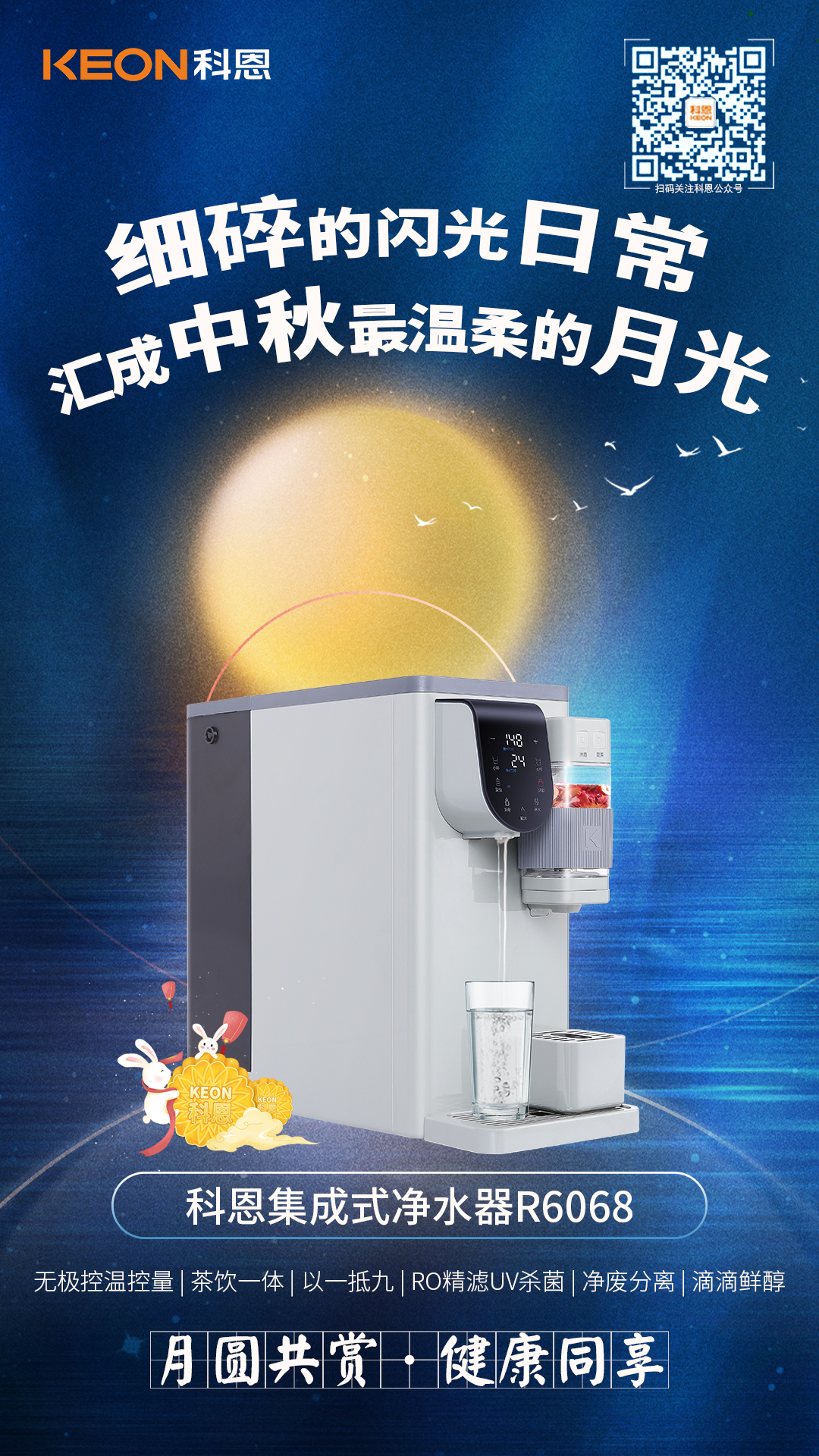 生活是一半人間煙火,一半山河遠(yuǎn)闊,你眺望詩和遠(yuǎn)方,卻也別忘了家的方向,卸下滿身疲憊,拋開城市的車水馬龍,用一臺科恩集成式凈水器R6068,一杯咖啡一壺清茶一杯溫度適宜的熱水,細(xì)碎的閃光日常,倒?jié)M愛的溫度,匯成中秋最溫暖的月光!