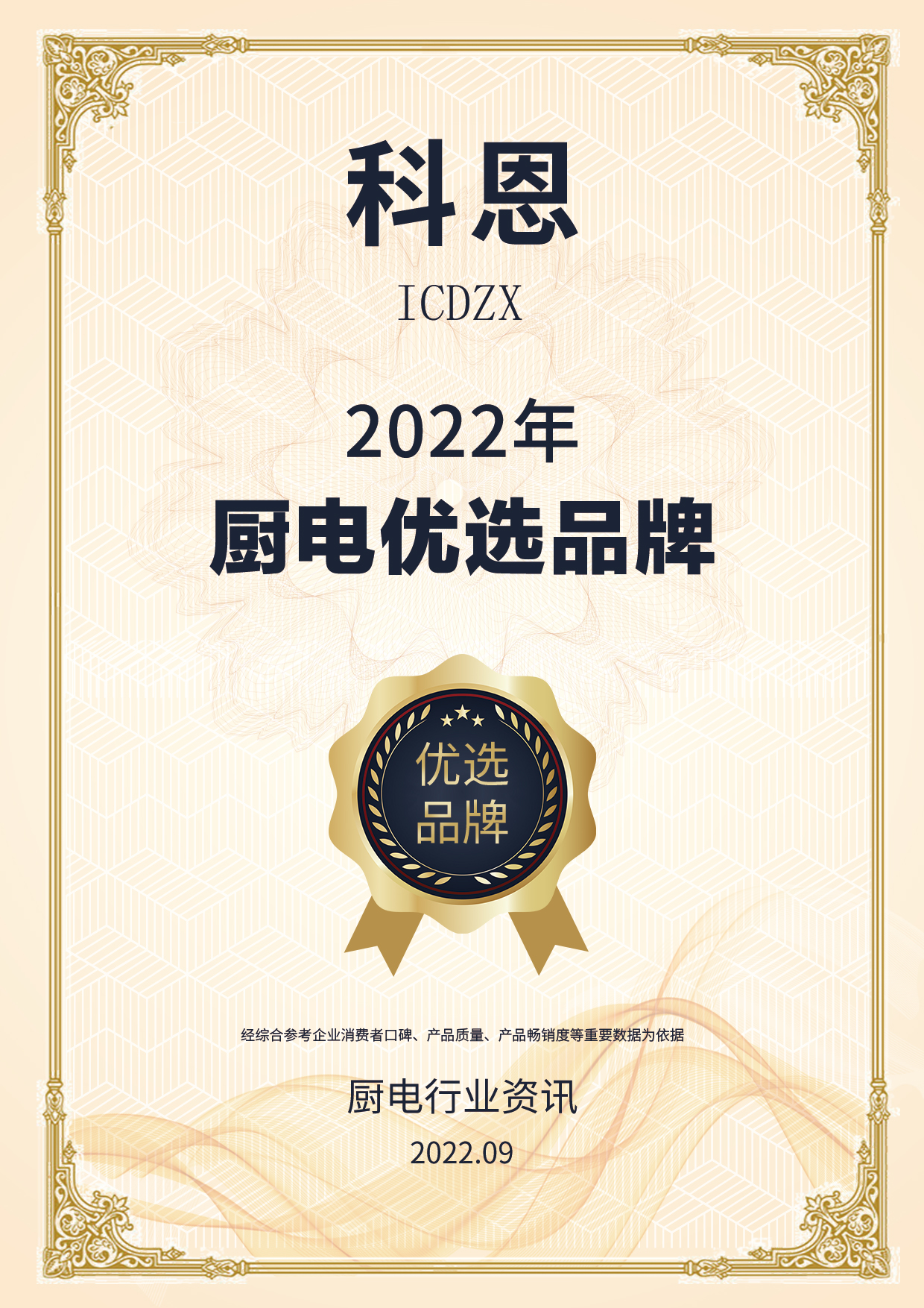 2022年9月作為我國第45個(gè)質(zhì)量月,廚電行業(yè)資訊(ID:cdhyzx00809)特舉辦了2022年度質(zhì)量月之廚電&集成灶優(yōu)選品牌評比(全國網(wǎng)絡(luò)評選),意在為廣大消費(fèi)者與經(jīng)銷商篩選出口碑好、產(chǎn)品質(zhì)量優(yōu)、售前售后服務(wù)到位的品牌。自評比活動啟動以來,經(jīng)過企業(yè)綜合實(shí)力篩選、資格初審、后臺評論、留言推薦、數(shù)據(jù)核對、綜合評審等階段,科恩電器憑借強(qiáng)大的品牌實(shí)力、優(yōu)質(zhì)的產(chǎn)品性能、領(lǐng)先出色制造工藝在諸多品牌中脫穎而出,斬獲兩大優(yōu)選品牌雙殊榮!