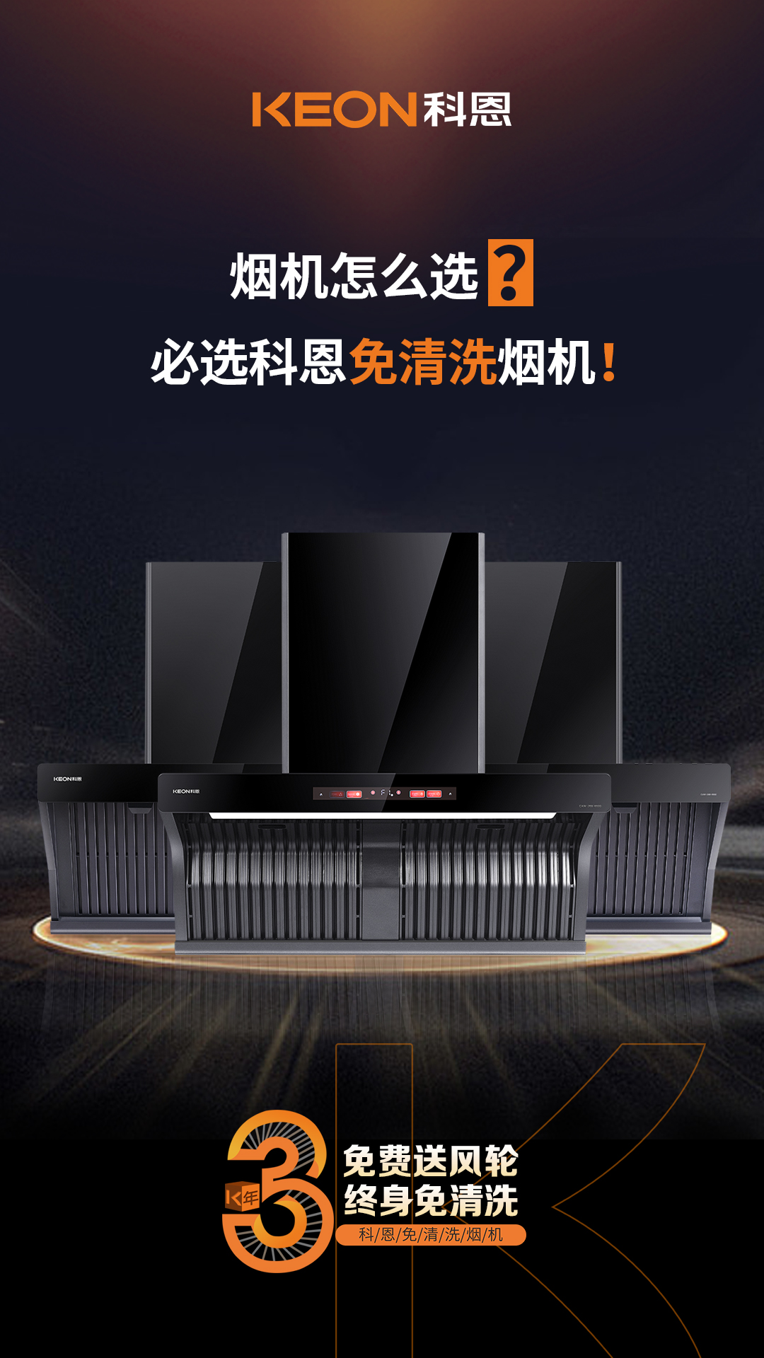 科恩電器行業(yè)率先提出3年免費(fèi)送風(fēng)輪服務(wù),徹底解決殘余油脂油污問(wèn)題,真正實(shí)現(xiàn)煙機(jī)終身免清洗!