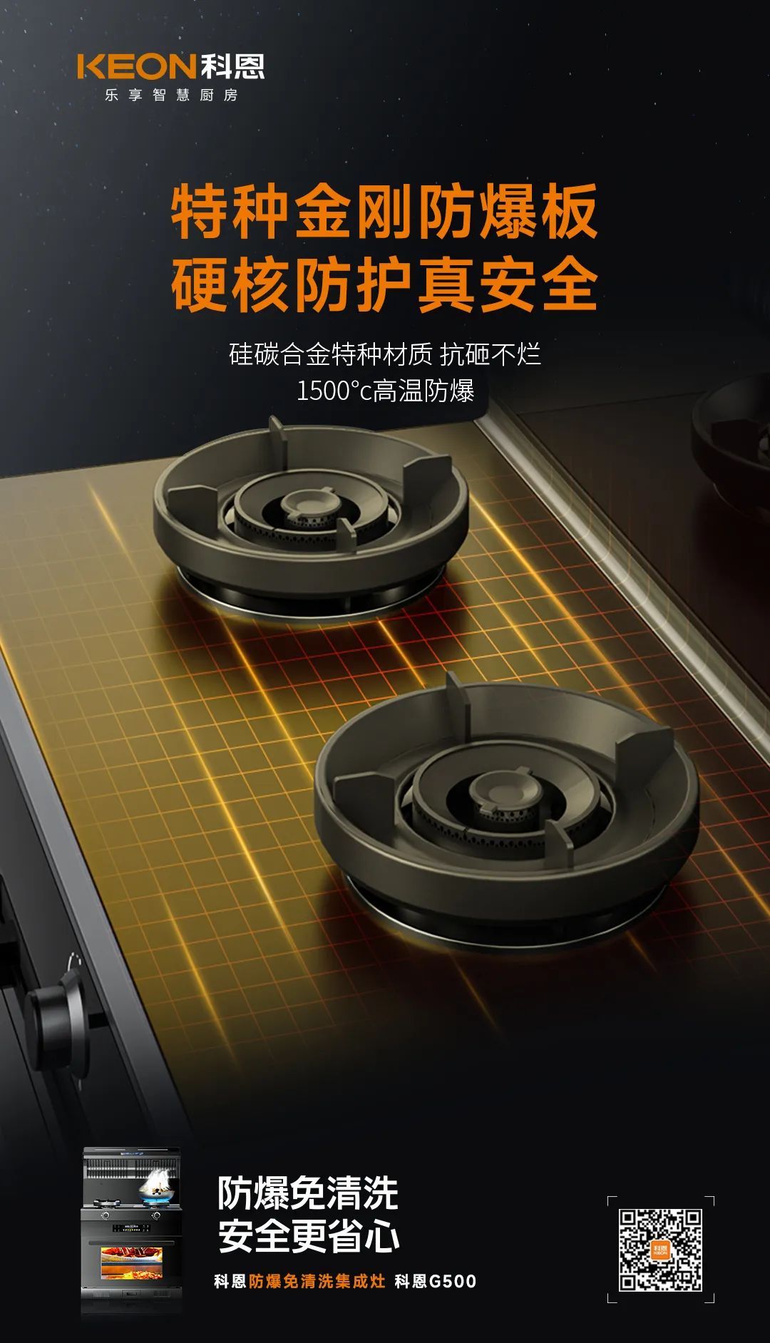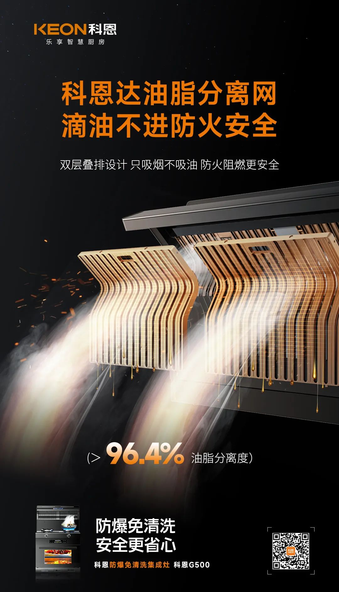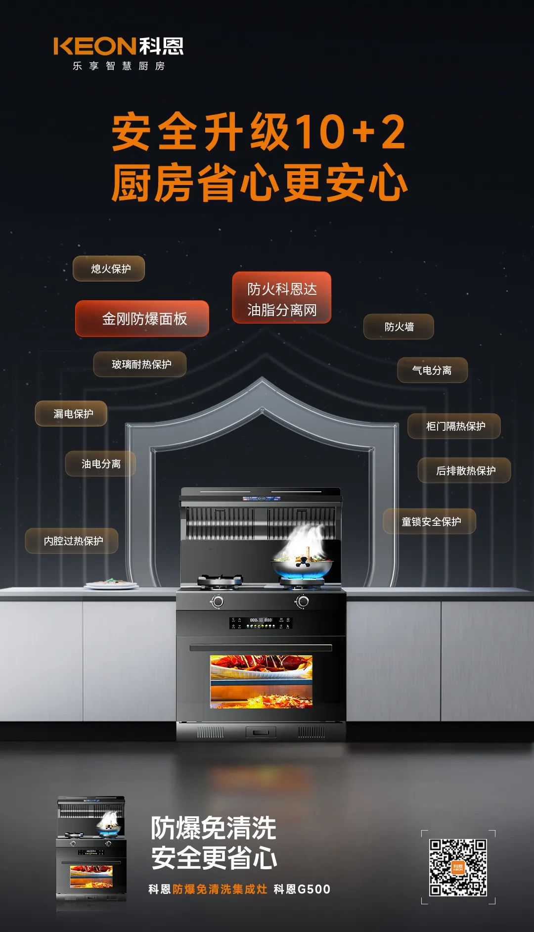 在傳統的10大安全前提之下,科恩G500新加入,防火科恩達油脂分離網、金剛防爆面板,為廚房安全再度升級防護。