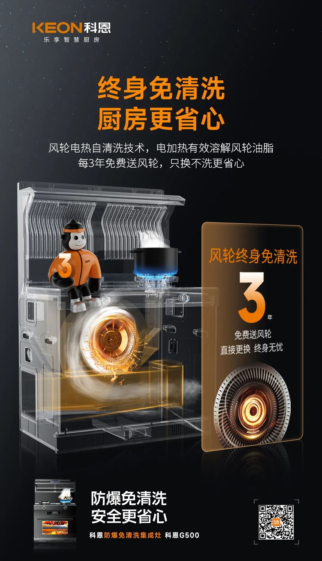 終身免清洗不是一句口號,而是一個行動!科恩每3年將免費提供風輪更換服務,徹底告別清洗,真正實現終身免清洗,廚房更省心!