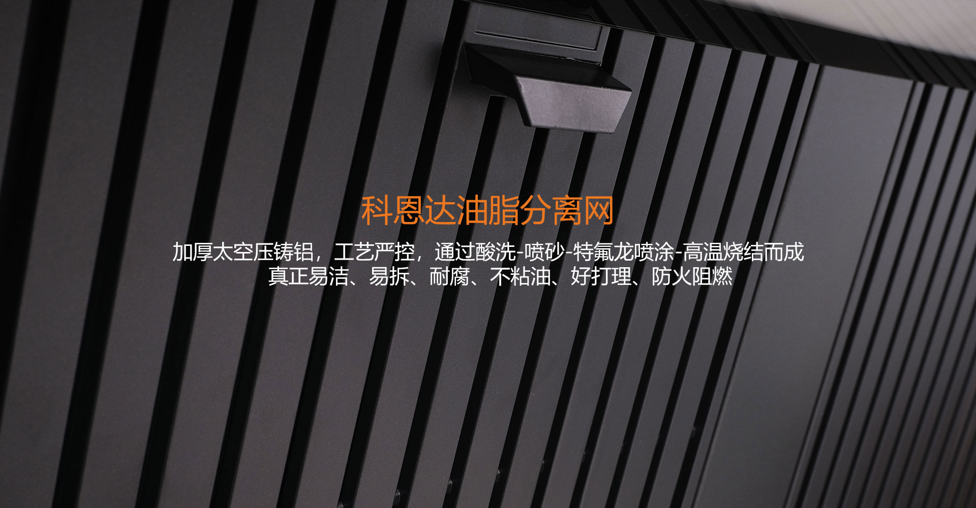 科恩達(dá)三層油脂分離網(wǎng),加厚太空壓鑄鋁,工藝嚴(yán)控,通過(guò)酸洗-噴砂-特氟龍噴涂-高溫?zé)Y(jié)而成真正易潔、易拆、耐腐、不粘油、好打理防火阻燃。