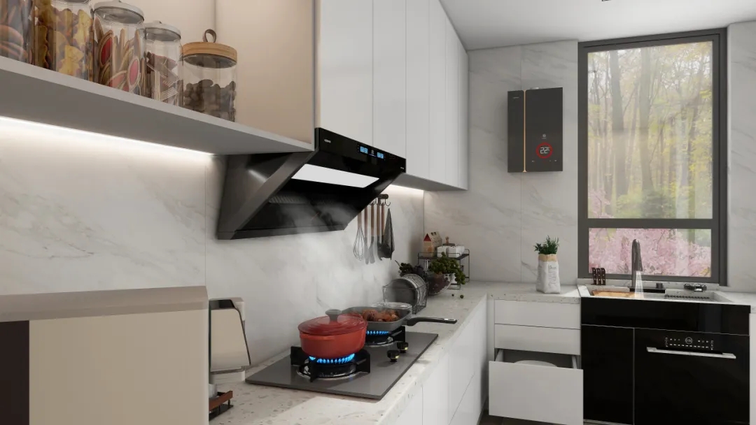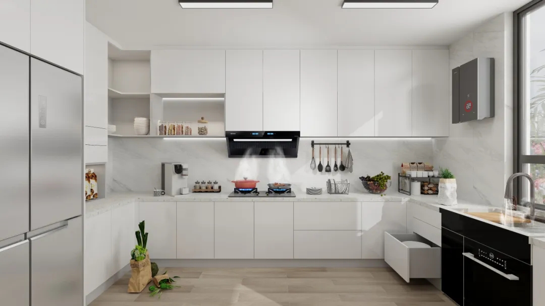 煙機(jī)方面:科恩5100歐近式超薄油煙機(jī),采用獨(dú)特的平嵌式設(shè)計,完美融入櫥柜之中。具備23m³/min颶風(fēng)吸力,可瞬吸濃煙,做到辣味不嗆鼻,妝容不油膩。