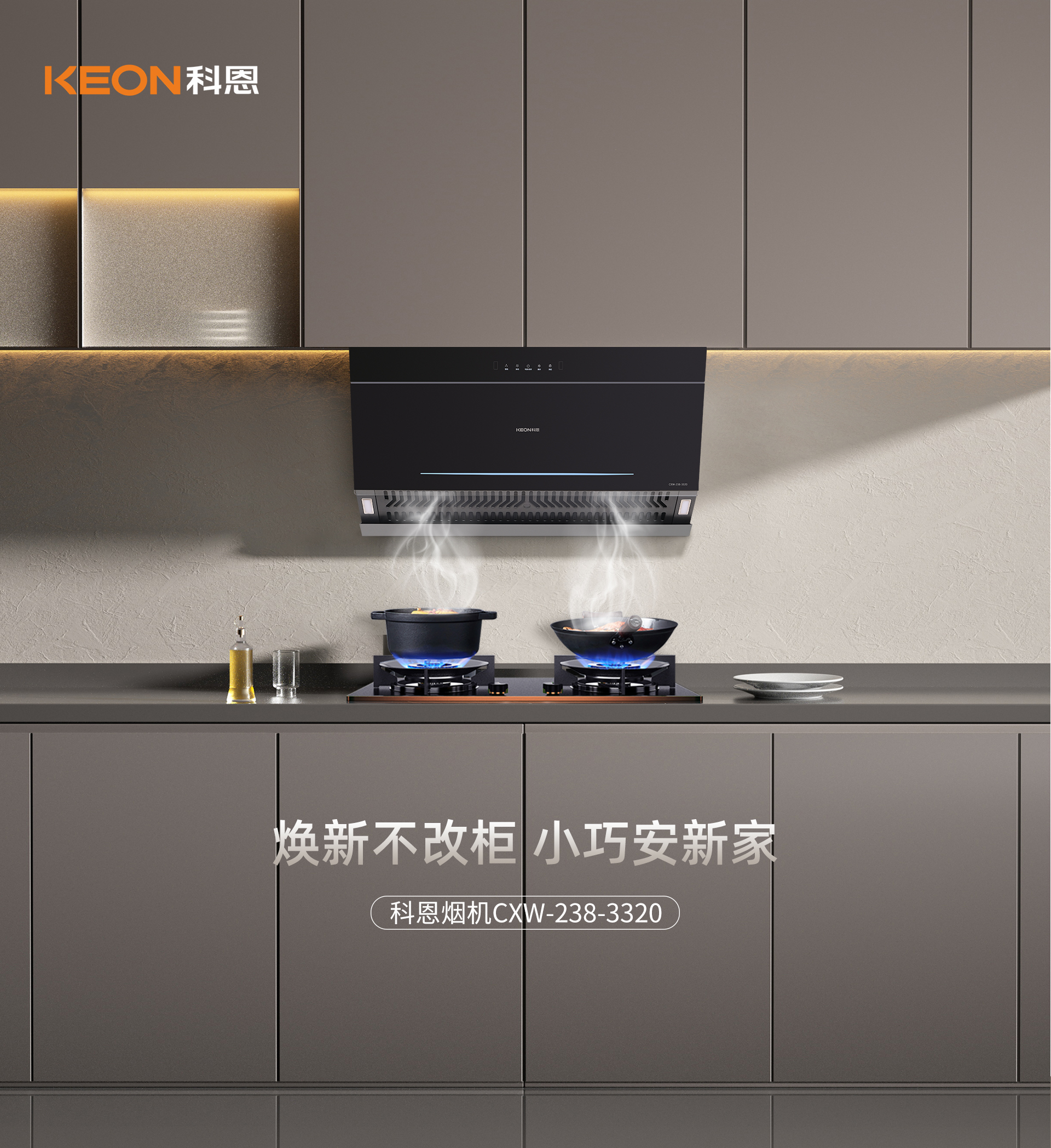對于老廚換新的家庭來說,理想的油煙機應具備煥新不改柜的特性。它能夠在不改動櫥柜的情況下順利安裝,以小巧的身形融入廚房空間,無論是新裝修還是廚房改造,都不會帶來額外的困擾與麻煩。而科恩3320煙機正具備了這樣的特點。