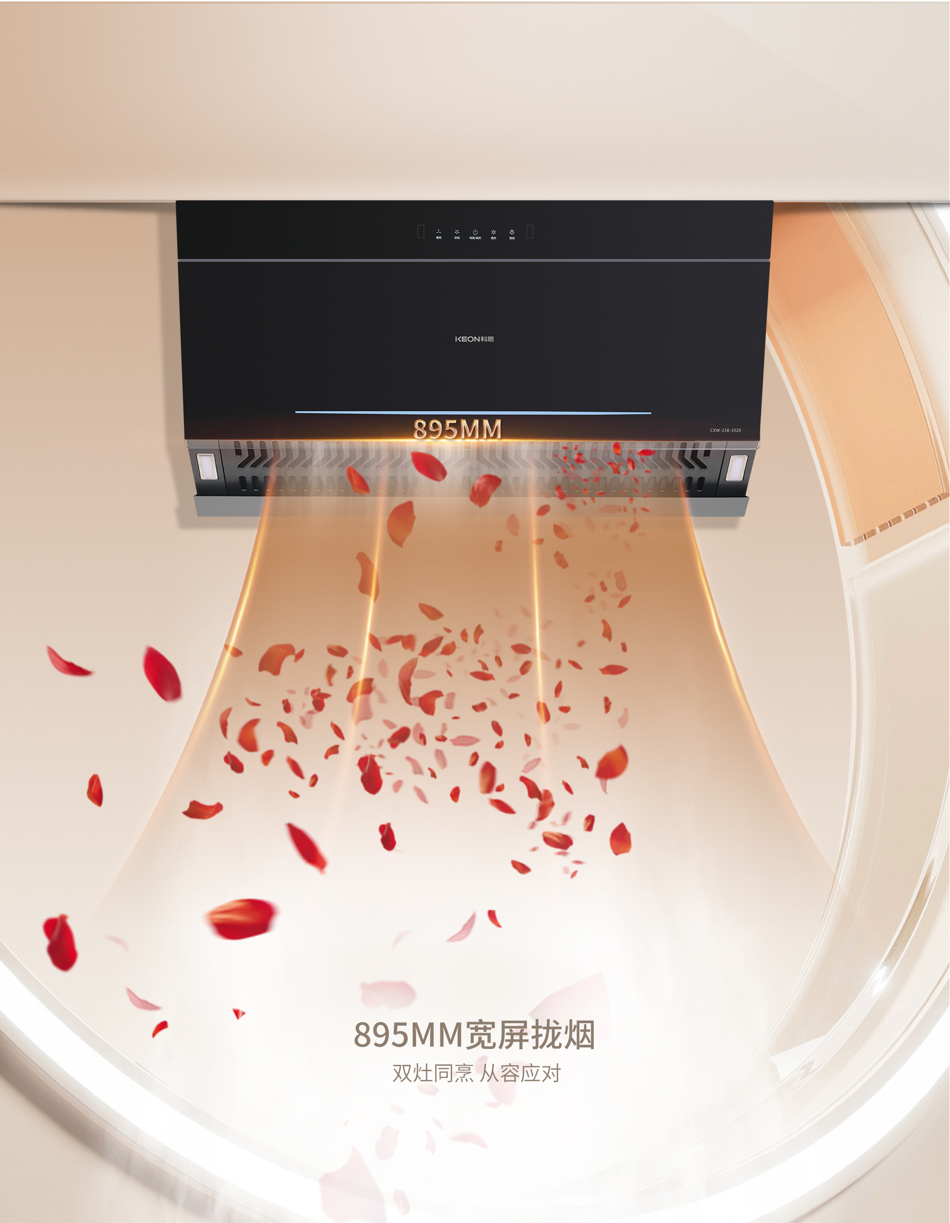 3320的吸煙功能更是重中之重。“260MM低空吸煙技術,能夠在油煙尚未升騰擴散之時,就將其精準捕捉,從源頭上控制油煙的擴散,讓廚房始終保持清新潔凈。而“895MM寬屏攏煙則從容應對雙灶同時炒菜的情況,寬大的攏煙屏確保油煙不會四處逃逸。具備2檔吸煙模式與爆吸模式,可根據不同的烹飪場景輕松切換,滿足多樣化的需求。攏吸排三點一線的設計則保證了精準吸煙與暢吸直排,讓油煙的處理過程高效流暢。
