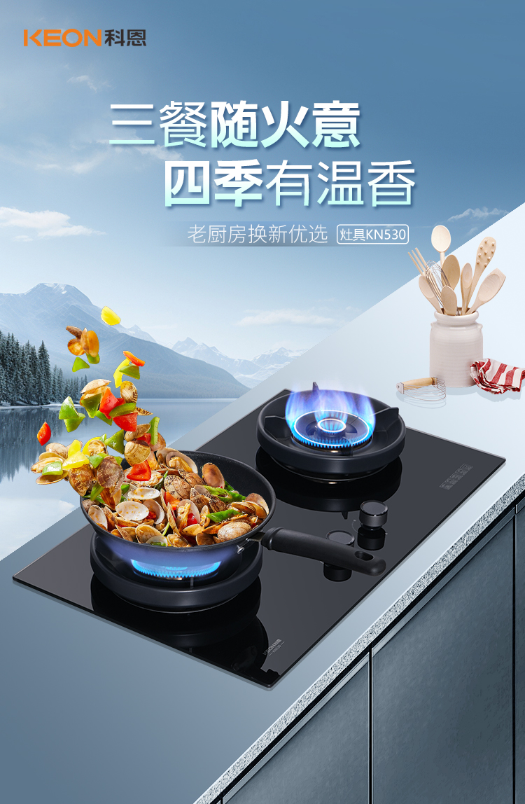 三餐煙火暖,灶間藏日常。老舊灶具總在烹飪時添堵,火候忽大忽小,炒不出脆嫩鍋氣,油污難擦,旋鈕發燙,科恩全新推出 KN530 灶具。以匠心設計破解廚房痛點,從老舊灶臺到全新烹飪空間,只需一次換裝,開啟美味新紀元。