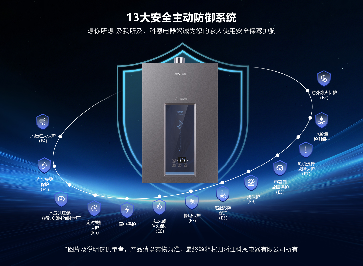 靜音節(jié)能,綠色安心。智能分段燃燒技術(shù),讓沐浴始終宜人,風(fēng)機(jī)低速運(yùn)行超靜音,享受寧?kù)o的沐浴體驗(yàn),熱效率高達(dá)89%以上,節(jié)能更環(huán)保,老房高層也能暢享穩(wěn)定熱水。十三重護(hù),安全無憂。13重全天候安全保障,守護(hù)全家溫暖,過熱、過壓、熄火保護(hù)三重防護(hù),意外停電或煙道堵塞時(shí)自動(dòng)斷氣,定時(shí)關(guān)機(jī)保護(hù),蜂鳴提⽰及報(bào)警功能,全面杜絕安全隱患,專注享受沐浴無后顧之憂。