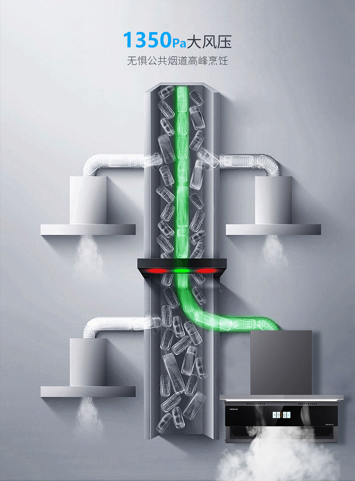- 1350Pa大風壓,無懼公共煙道高峰烹飪
